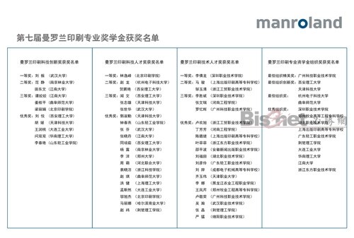 近日,2011年度第七届曼罗兰印刷专业奖学金评选活动圆满落下帷幕。2003年创立的曼罗兰奖学金,经历7年的磨砺,已经成为了印刷教育界最具权威的奖学金之一,深受印刷院校的推崇,参与院校与报名人数逐年上升。第七届曼罗兰奖学金吸引了近1400人,46所院校报名,是参与学生人数最多的一届。经过层层选拔,通过曼罗兰评审委员会的专业审定,最终由武汉大学刘振同学、北京印刷学院林逸峰同学、深圳职业技术学院李倩龙同学和广州科技职业技术学院 ,分别获得印刷科技创新奖一等奖、印刷科技人才奖一等奖、印刷技术人才奖一等奖和最佳组织精英奖。获奖名单已刊登在曼罗兰的网页:http://www.manroland.cn/scholarship/Awardslist.html