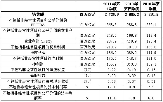 - 不包括非经常性项目和公平价值的季度营业利润为2.48亿欧元,较2010年同比增加了1.29亿欧元,增幅达到108%,不包括非经常性项目和公平价值的 EBITDA(利息、税项、折旧、摊销前收益)增长了59%。