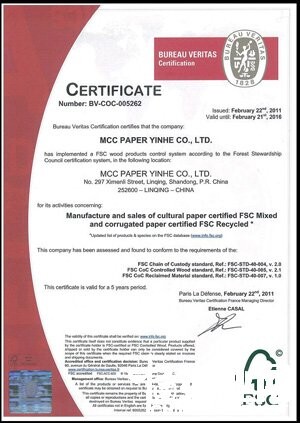 为增强银河纸业的产品竞争力,自2010年7月22日开始,该公司成立了由办公室、环保处、人力资源处、文化纸销售公司、瓦楞纸销售公司、进出口公司及其他相关职能部门组成了FSC认证推行小组。企业明确了管理者代表,确定了FSC认证产品组清单,编制了FSC-COC管理手册,组织人员对相关部门、车间的人员进行了培训,逐步完善了各部门的资料文件和记录,并进行了FSC产品试生产,形成了FSC-COC管理体系。2010年11月10日,该公司通过了BV国际检验集团审核专家的现认证审核。2011年2月22日,该公司FSC-COC管理体系审核报告通过了法国BV国际检验集团总部的认可,获得了该集团颁发的FSC体系认证证书。