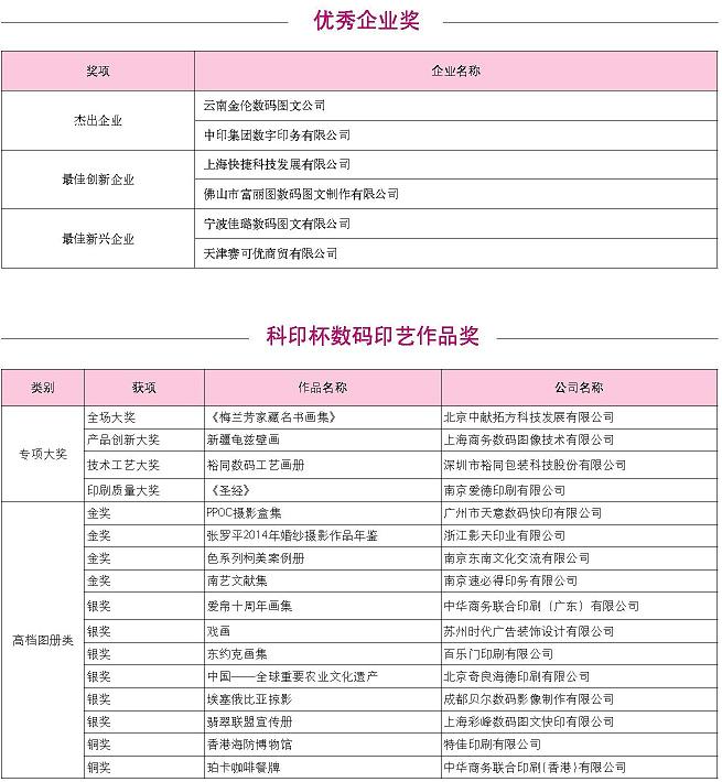 本届大奖赛首次尝试与佳能(中国)有限公司合作,设“科印杯”及佳能双重奖项,得到全国各地印刷企业的积极参与,大赛组委会从各地收悉来自168家企业的519件优秀作品,最终评选出“科印杯”4个专项大奖、19个金奖、26个银奖、34个铜奖以及38个评委推荐奖。针对“优秀企业奖”的评选,最终评出2家杰出企业、2家最佳创新企业以及2家最佳新兴企业。