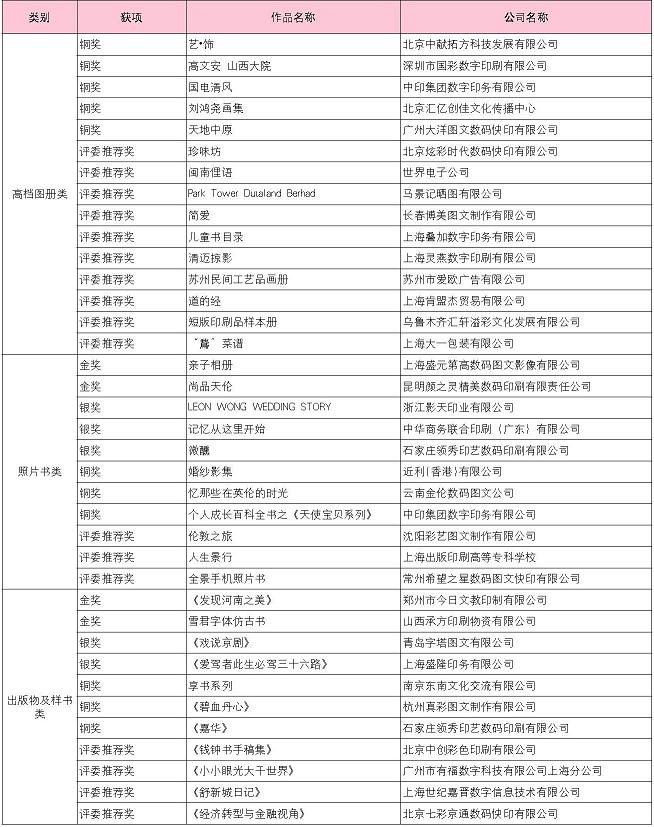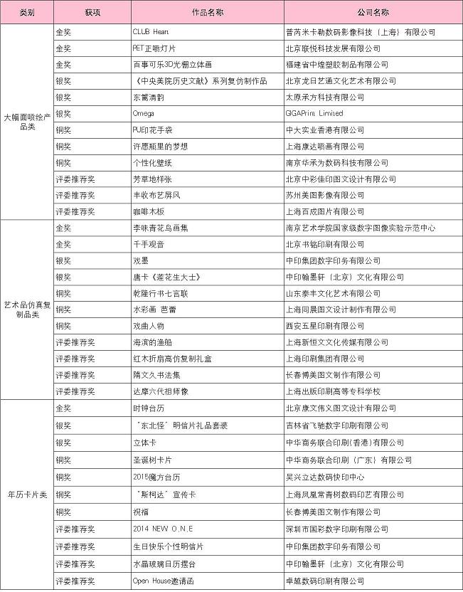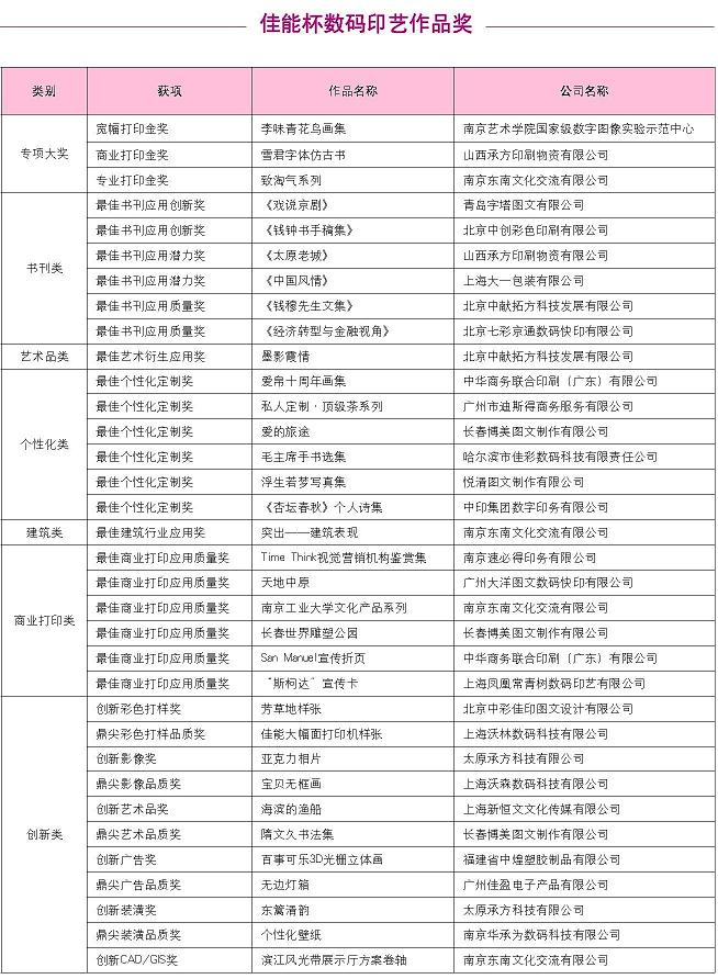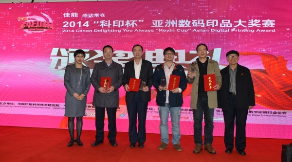 三个佳能全场大奖中,南京东南文化交流有限公司选送的致淘气系列获佳能专业打印金奖、南京艺术学院国家级数字图像实验示范中心选送的李味青花鸟画集获佳能宽幅打印金奖、山西承方印刷物资有限公司选送的雪君字体仿古书获佳能商业打印金奖。