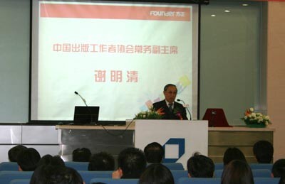 中国出版工作者协会常务副主席谢明清在致辞中表示:现在电子书、数字期刊、网络媒体等阅读方式不断呈现,传统出版正逐步走向数字出版,越来越多的纸质出版物以网络媒体及数字出版物的形式同步发行。中国出版业也正面临重要的转型与突破,需要有更多更好的技术来支撑发展中的转型。相信方正电子的创新技术及产品能够为出版行业的发展提供动力。